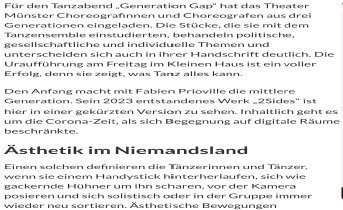 Münster Im Kleinen Haus des Theaters stand am Wochenende der Tanzabend „Generation Gap“ auf dem Spielplan. Die Akteure zeigten eindrucksvoll, was Tanz alles kann.
