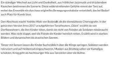 Die mit ihrer Company bodytalk seit zehn Jahren im Münsteraner Pumpenhaus residierende Choreografin Yoshiko Waki präsentiert im letzten Teil das für Tanz Münster adaptierte Tanztheaterstück GLÜCK, das 2017 beim Kaunas International Dance Festival (Litauen) unter dem Originaltitel GLÜCK / LAIMĖ \ СЧАСТЬЕ uraufgeführt wurde. Damals handelte es sich um eine Koproduktion zwischen bodytalk mit dem Kaunas Dance Theater AURA in Litauen und dem Theater im Pumpenhaus, welche durch die Bezirksregierung Münster sowie das Ministerium für Kultur und Wissenschaft des Landes NRW gefördert wurde.